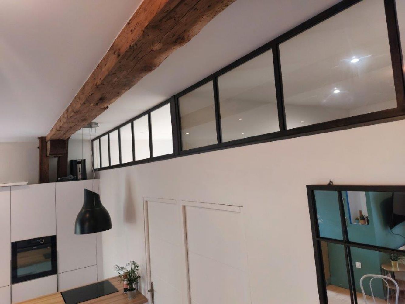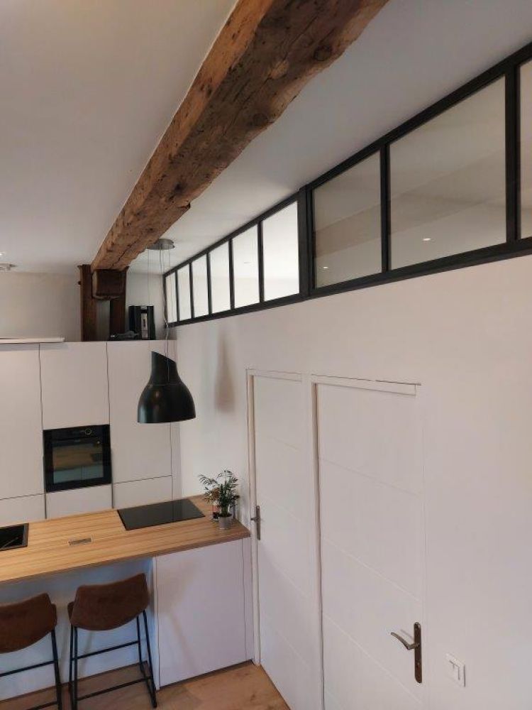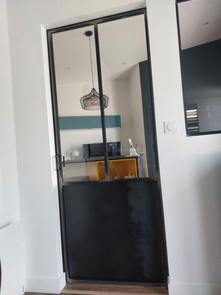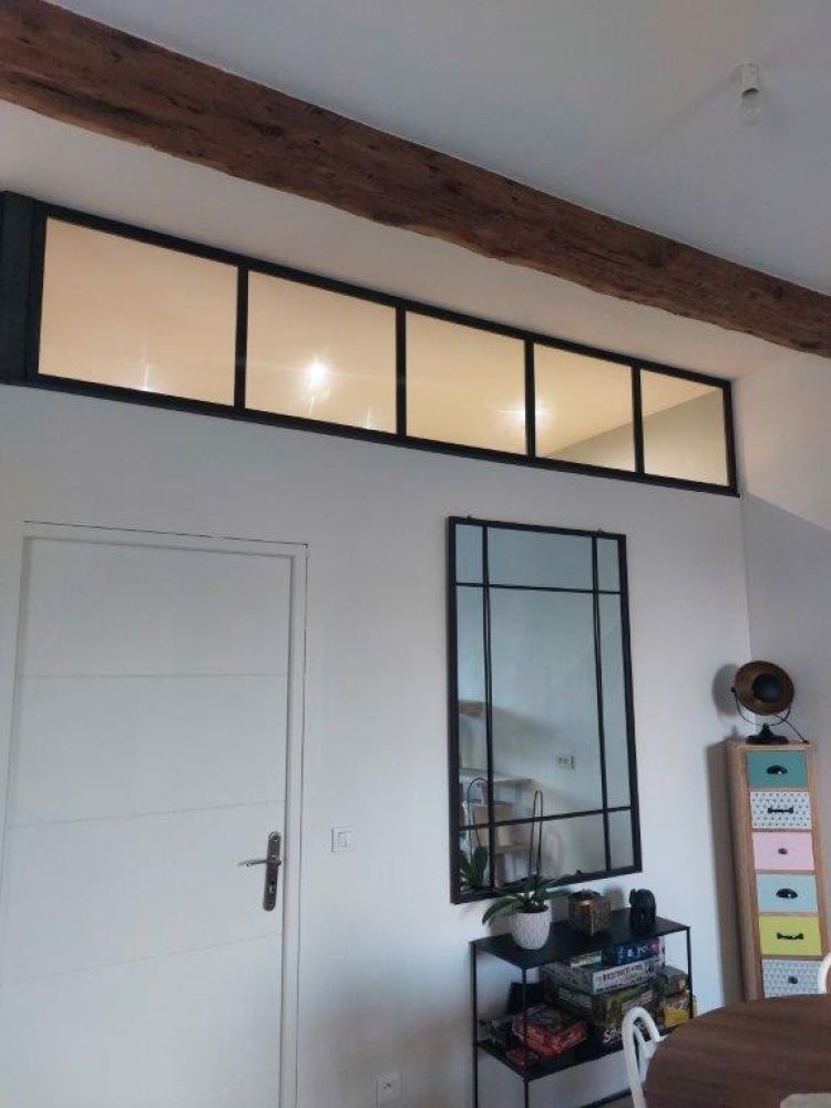 Peu d’ouvertures dans cet appartement, avec une chambre ne disposant pas de fenêtre, ces 2 impostes vitrées en acier permettent à la lumière de circuler dans chacune des pièces ! Les pièces sont devenues lumineuses avec du style.
