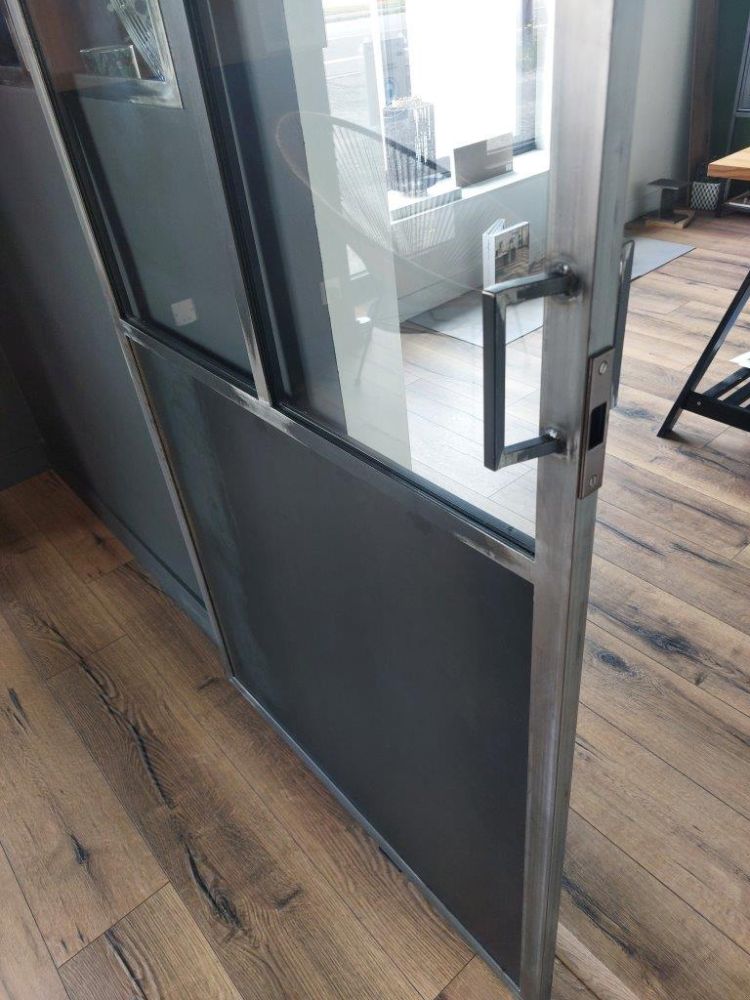 De finition brut pour un total look industriel, cette réalisation a été créée sur mesure pour notre show-room. Dotée d’une porte coulissante avec système silencieux, cette configuration offre un espace de travail calme et lumineux, laissant une visibilité sur l’entrée.