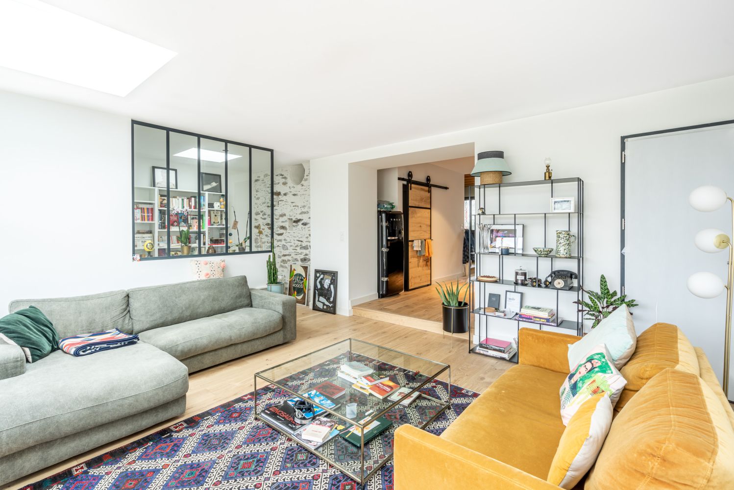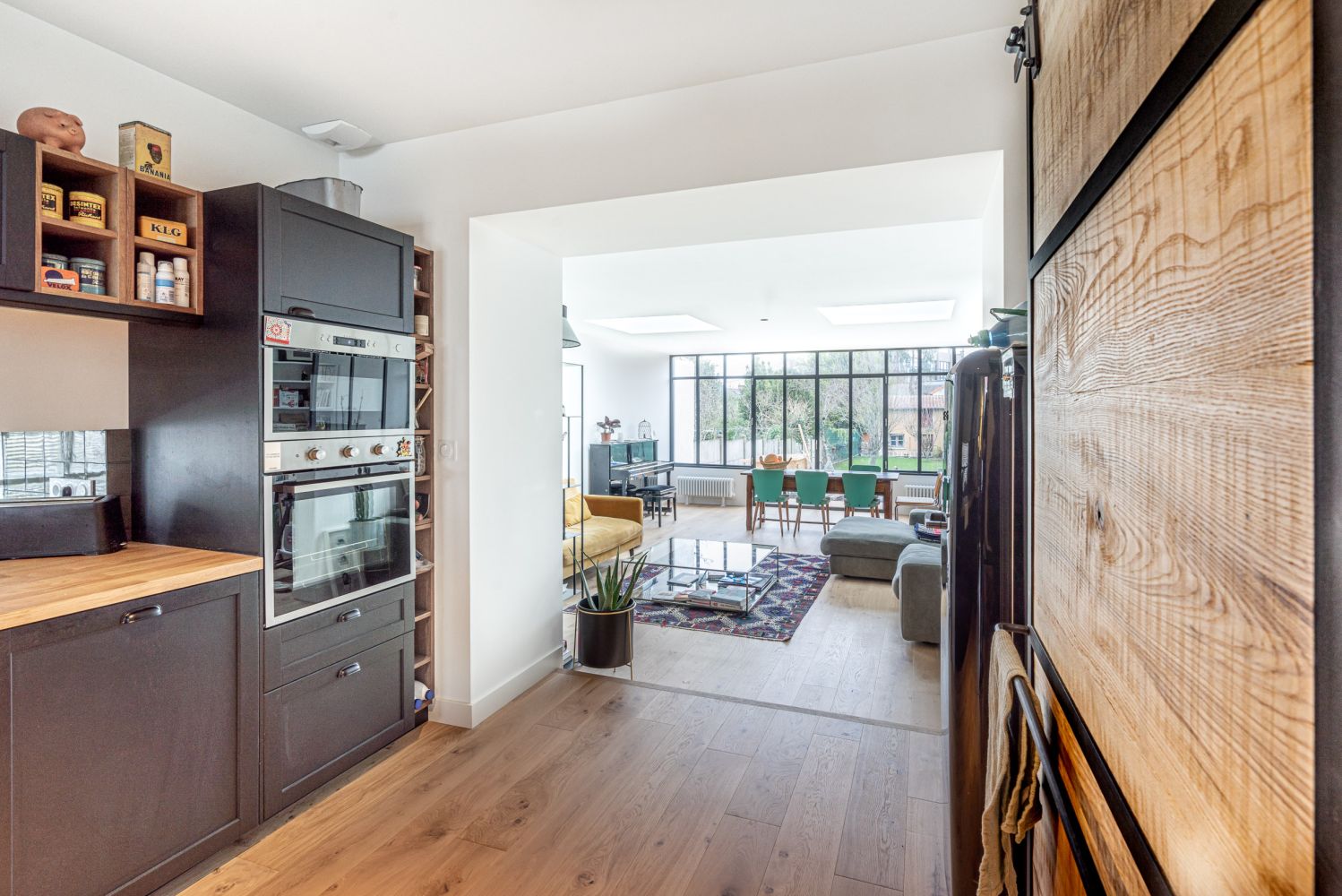 Cette extension en ossature bois et revêtue d'un bardage en Mélèze de Sibérie, accueille une magnifique verrière façon atelier. La toiture est composée d'une couverture en membrane PVC et la lumière provient de deux coupoles transparentes de la marque Velux.