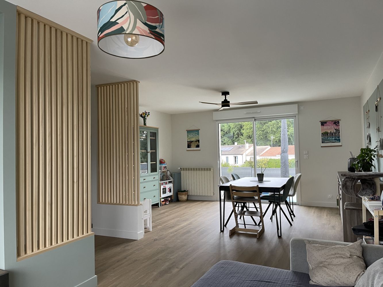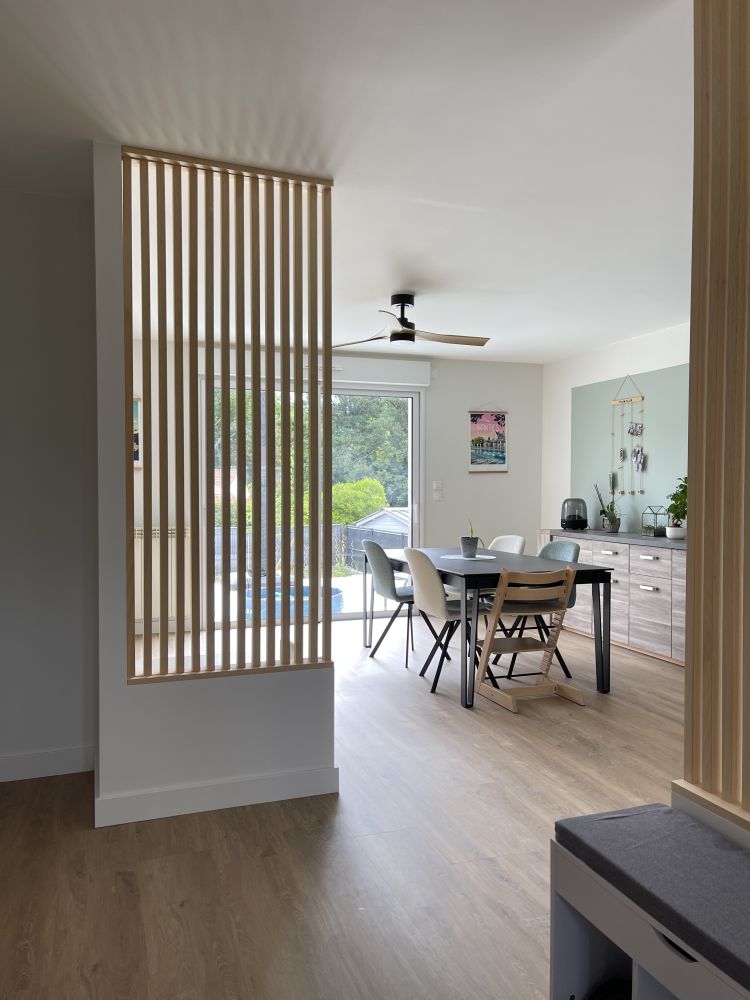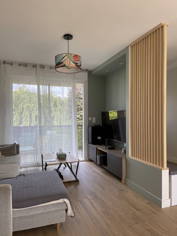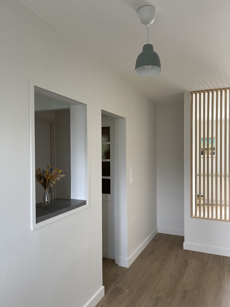 Le résultat est à la hauteur des attentes : une entrée repensée et fonctionnelle, un salon mieux positionné pour tirer parti de la lumière naturelle, un séjour accueillant idéal pour recevoir, et surtout une grande baie vitrée qui ouvre désormais la pièce de vie sur l’extérieur. Cette transformation a redonné de la cohérence et de la modernité à l’ensemble de l’habitation, tout en valorisant la connexion future avec la terrasse à venir.