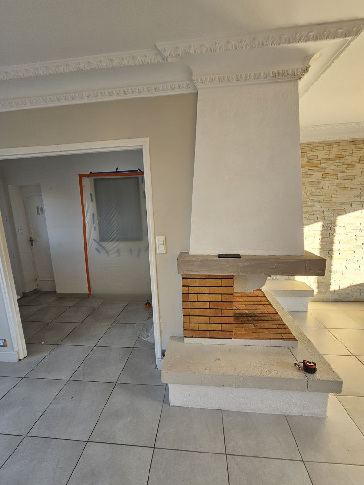 Les travaux ont débuté par une démolition ciblée : l’ancienne cheminée, une allège de fenêtre, des cloisons, ainsi que les éléments décoratifs datés comme les corniches, parements muraux et rosaces ont été retirés pour faire place à un espace plus fluide et moderne.