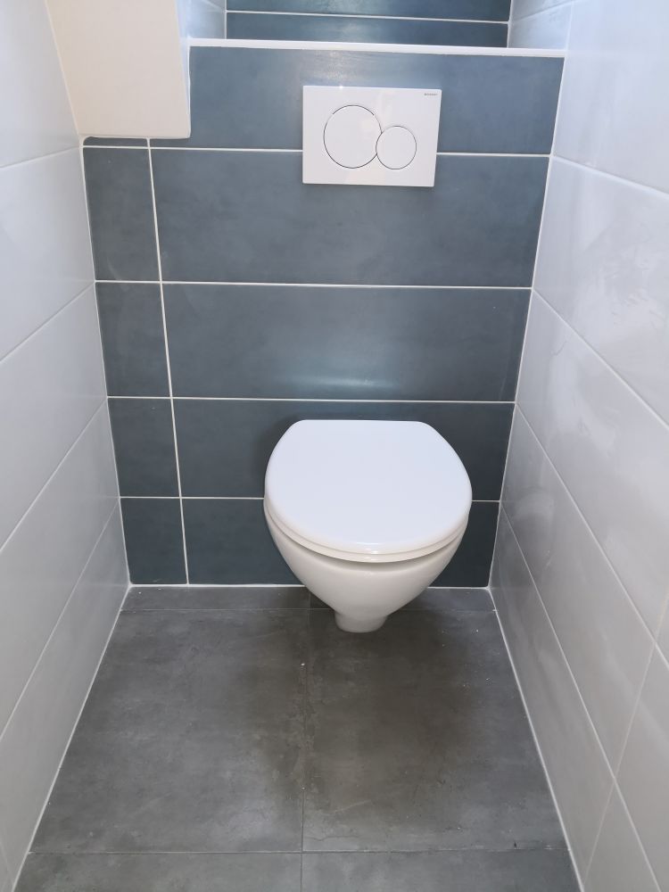 Voici la transformation des WC. La décoration reste la même que la salle d'eau avec un sol et des murs identiques. Le WC suspendu choisit par nos clients est un Geberit sans bride, beaucoup plus facile pour l'entretien.