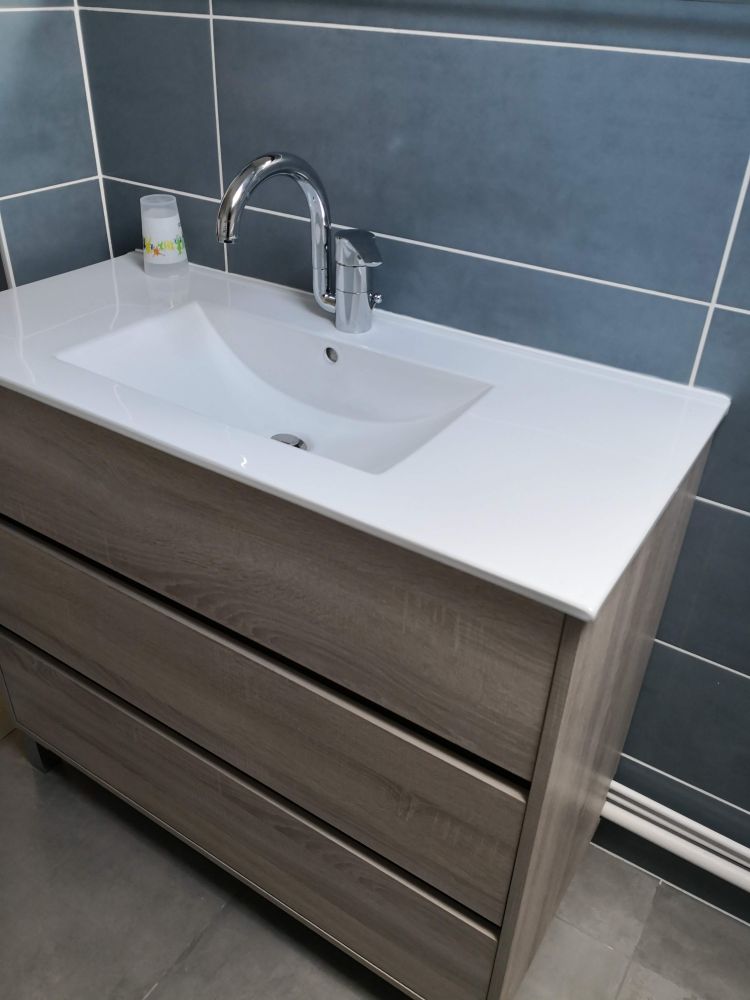Pour l'aménagement de la salle d'eau, un meuble avec plan céramique a été installé. Il est composé de trois tiroirs et d'un miroir avec applique. Son décor est en imitation chêne.