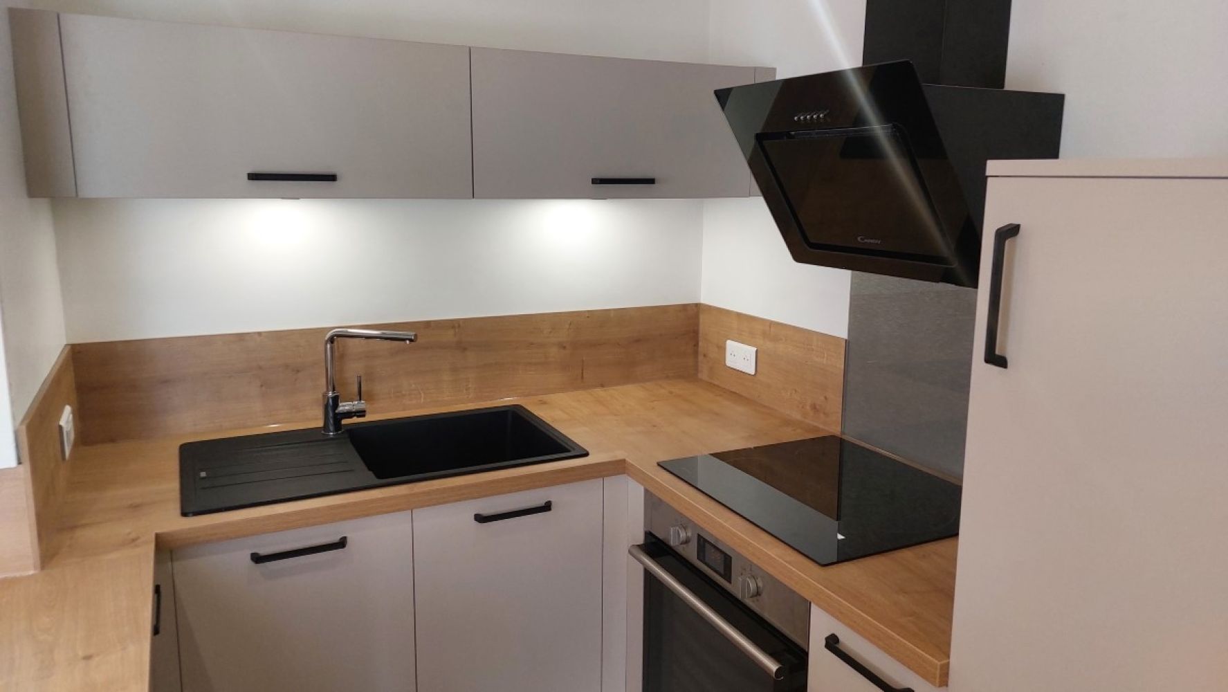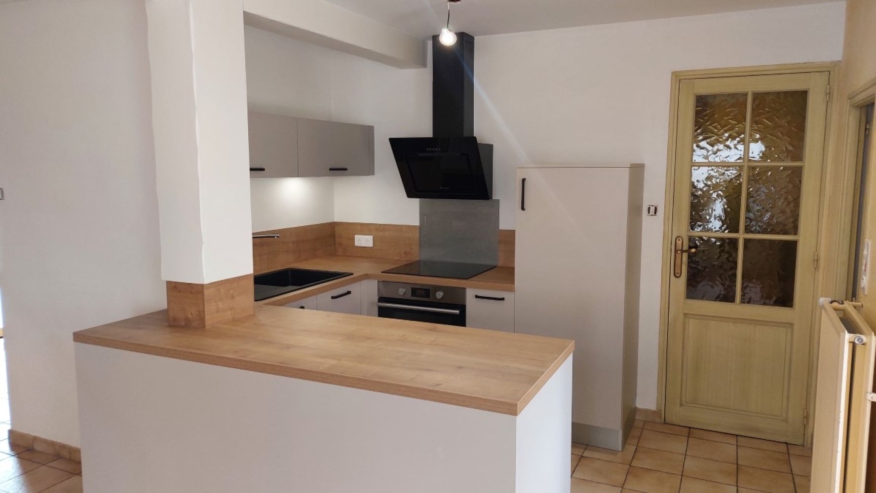 Pour ceux qui voudraient la même cuisine, notre cliente a choisi le modèle glacée Cachemire mat avec un plan de travail stratifié chêne du jura et des poignées fines noires de style industrielle. Le look est épuré et très contemporain, ce qui modernise l’ensemble de la maison.