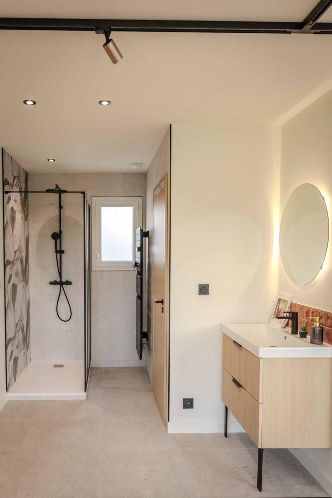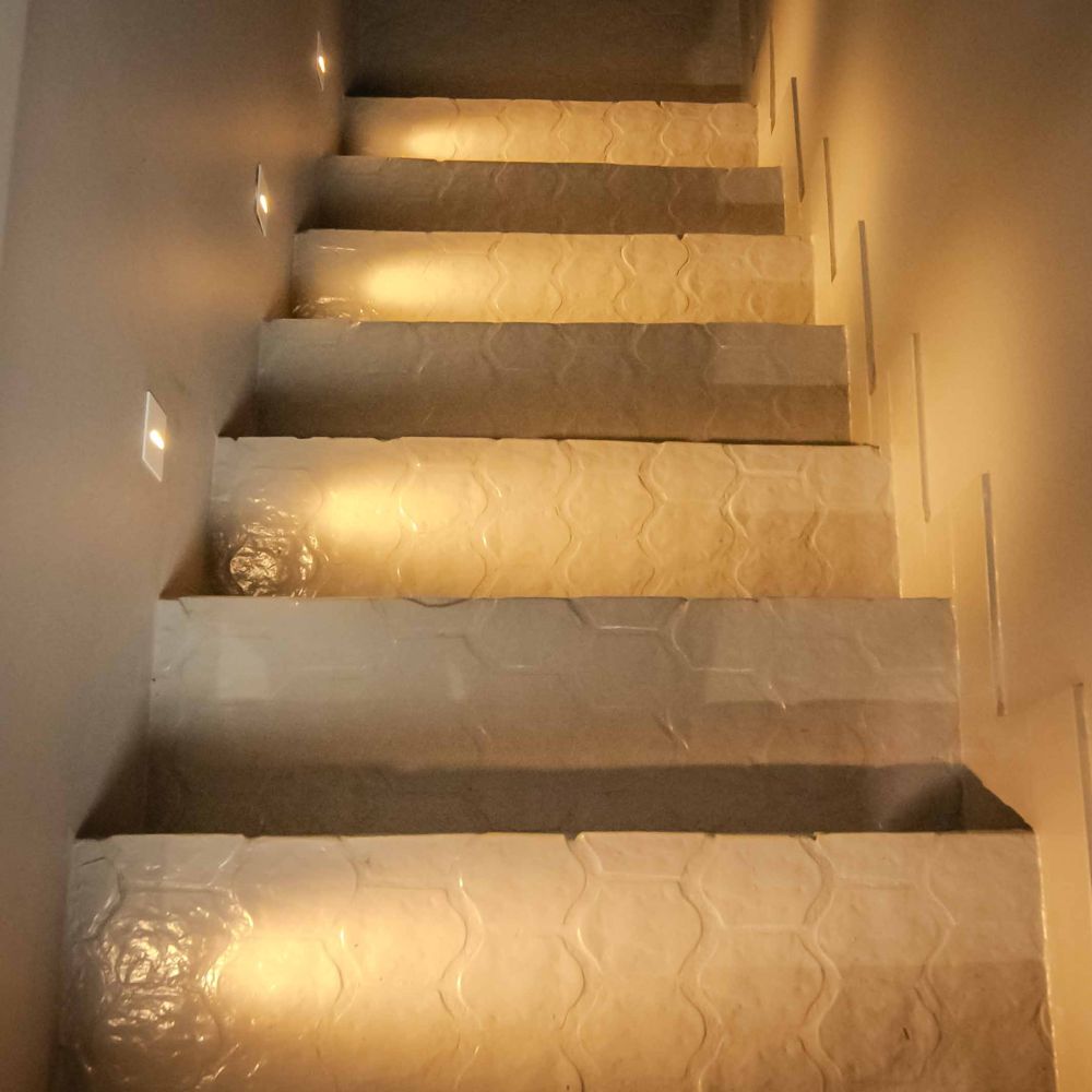Nous avons installé un éclairage varié, comprenant des rails au plafond, des spots, des appliques, ainsi qu’un éclairage pour l’escalier et l’extérieur, afin de mettre en valeur les différents espaces.