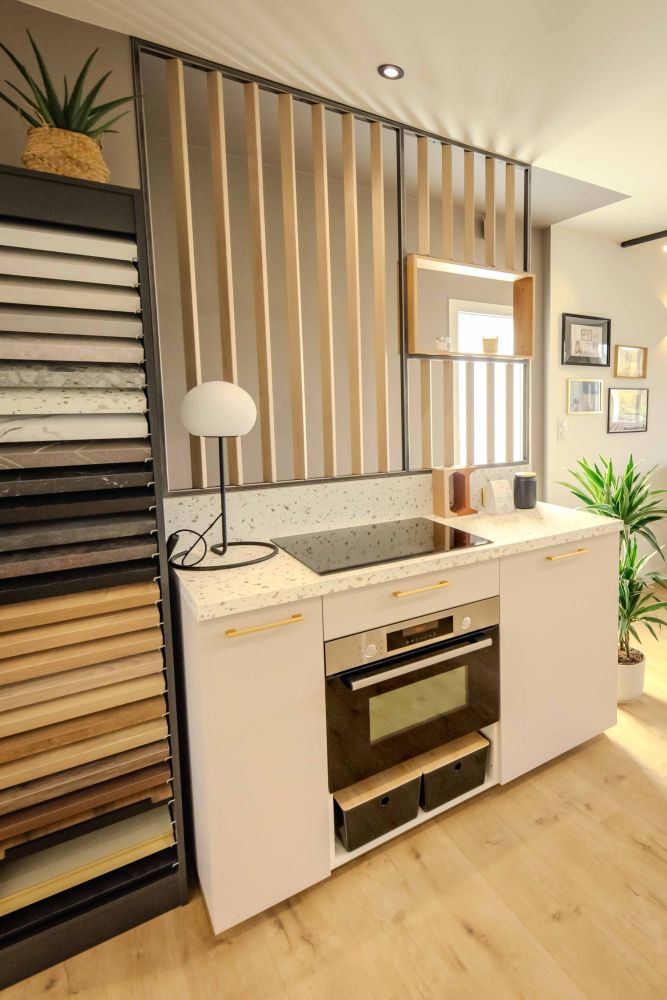 Chaque espace a été soigneusement aménagé et décoré. La cuisine, les bureaux, la salle de réunion, la pièce de vie, le salon, la salle de bain et les WC ont été équipés de mobilier et d’accessoires choisis avec soin. Cet aménagement permet aux clients de se projeter et d’imaginer les possibilités offertes par l’espace, d’apprécier la qualité des matériaux et la mise en œuvre. Voir les tendances déco