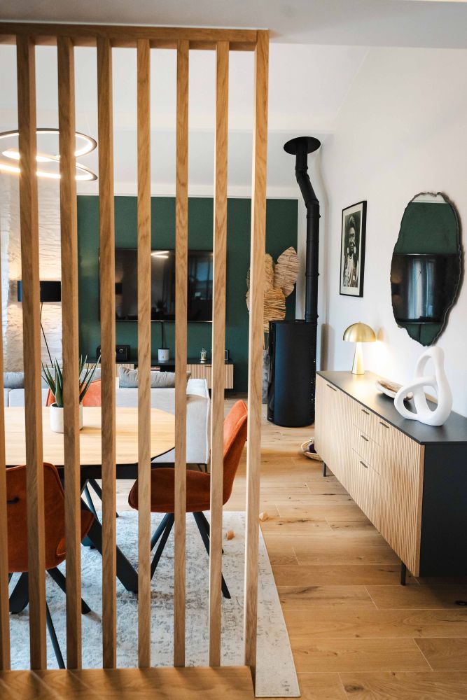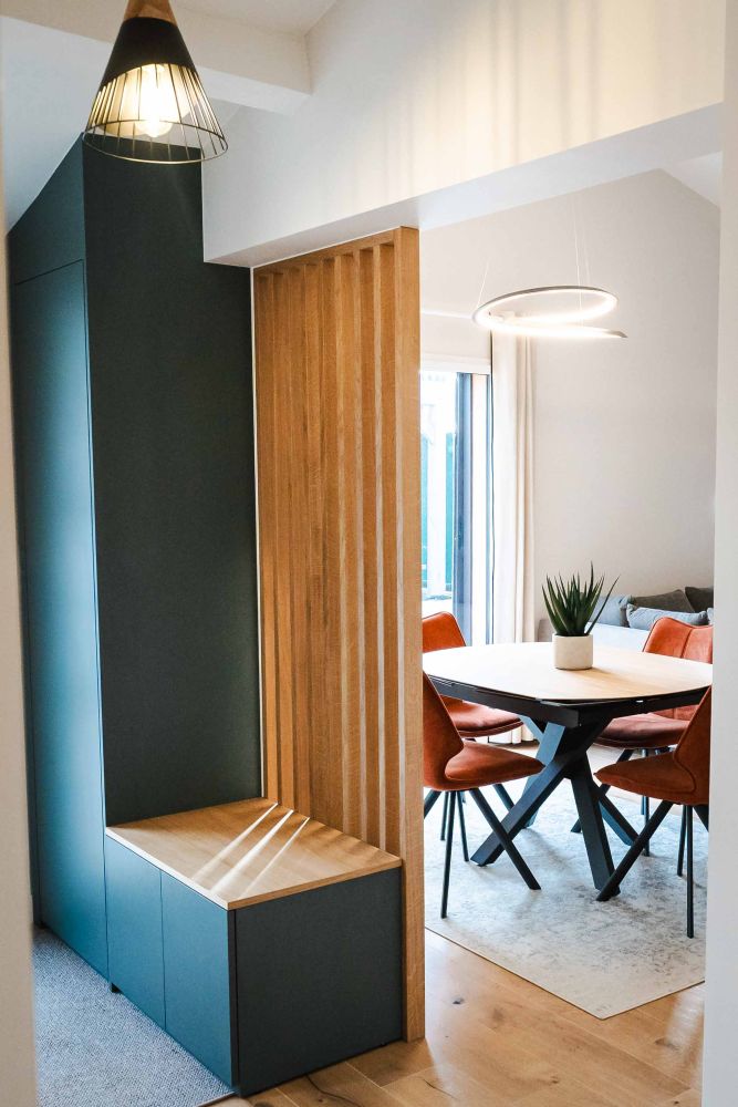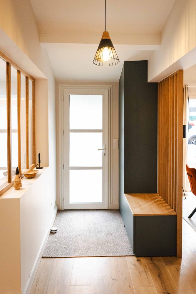 L’aménagement sur mesure a joué un rôle clé dans l’optimisation des espaces avec l’ajout de claustras, de rangements optimisés, de portes coulissantes et d’une verrière. Une tête de lit personnalisée a également été installée pour sublimer la chambre à coucher.