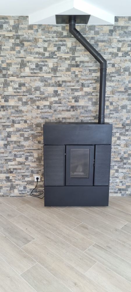 Le boisseau sera coffré par des plaques de plâtre et le mur recouvert de parement. Le nouveau chauffage choisi par nos clients : un poêle à granulés. Pour ce dernier, nous avons ajouté une prise de courant.