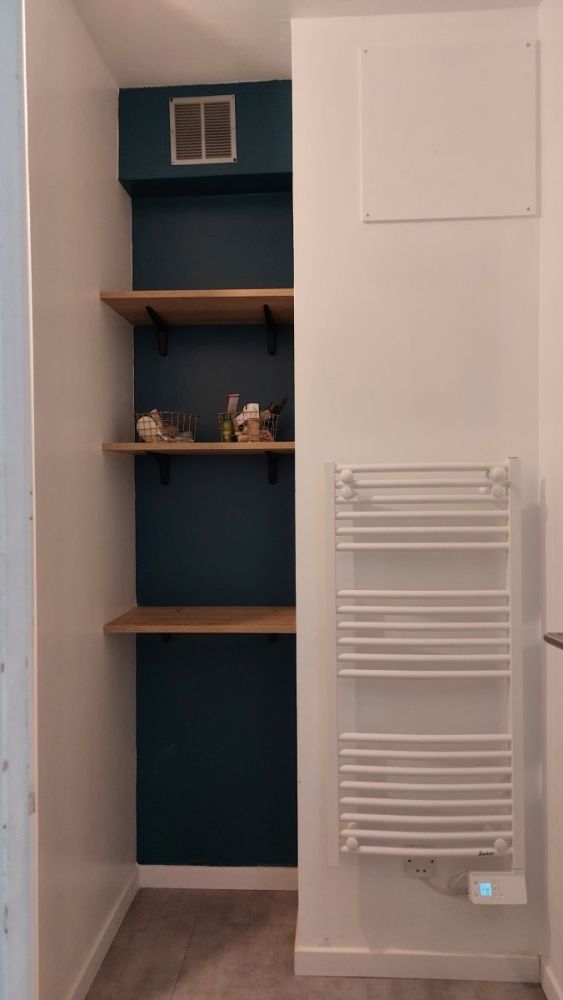 Etagères de rangements sur-mesure, espace douche spacieux, meuble vasque 2 tiroirs et sèche serviette, le tout dans une décoration actuelle.