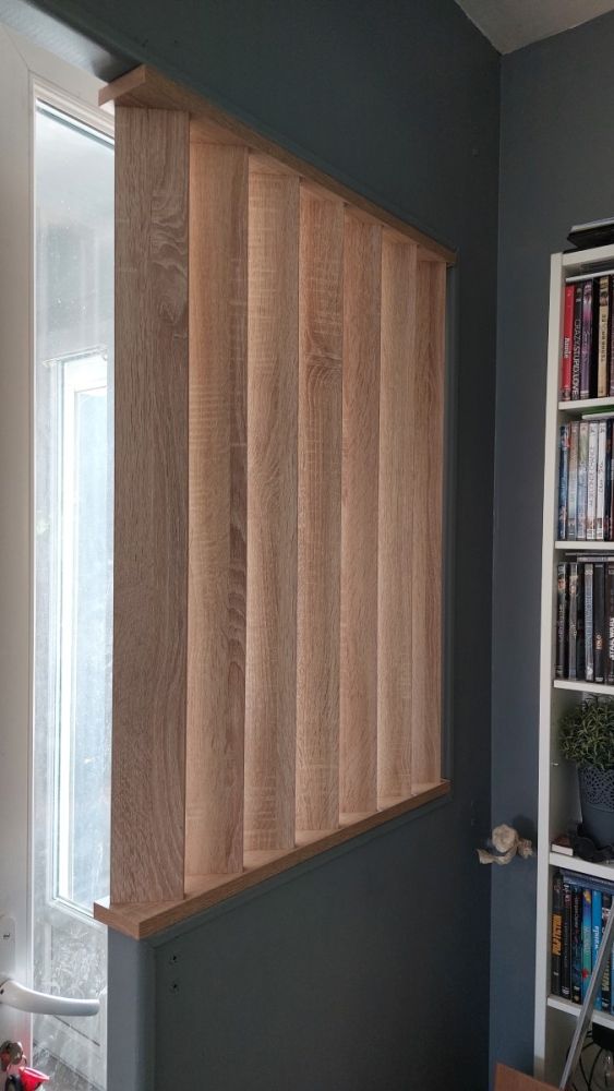 Anciennement une ouverture de porte intérieure donnant sur la cuisine, nous avons créé un soubassement en placo avec un joli claustra en bois. Un second claustra décoratif a été réalisé dans la cuisine afin de la séparer de la salle à manger.