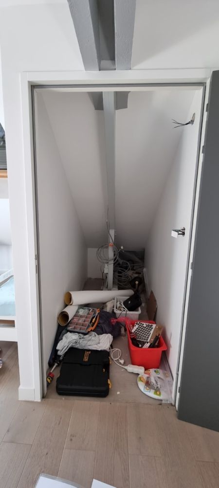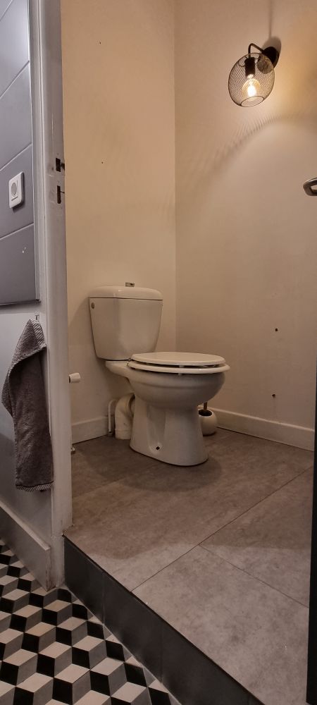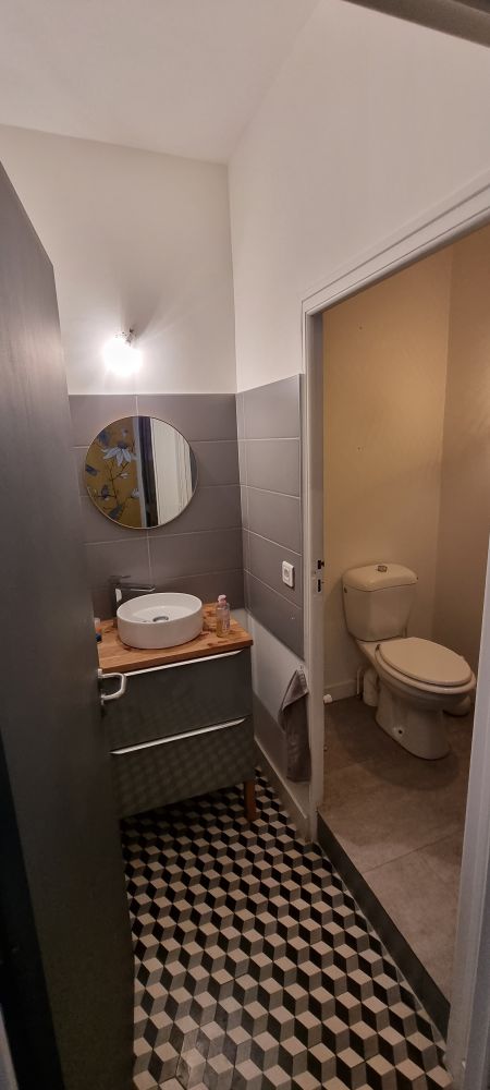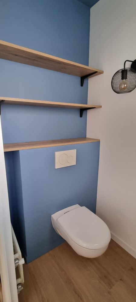 La deuxième phase a concerné l'étage 1 et les combles. À l'étage 1, il a fallu démonter le WC existant, et installer un WC suspendu avec un habillage en placo. Le placo a également servi à créer une colonne d'évacuation pour le WC des combles. Les revêtements ont été choisis dans le même esprit que le rez-de-chaussée : du carrelage et de la peinture. Une tablette a complété la décoration.