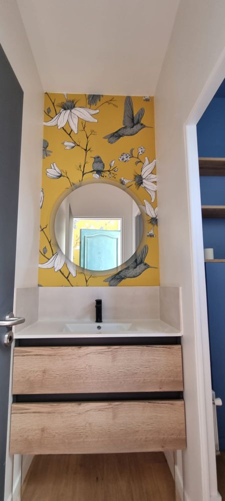 Les travaux se sont déroulés en deux phases, pour ne pas supprimer les deux WC en même temps. La première phase a concerné le rez-de-chaussée, où il a fallu démonter les anciens WC et le meuble, la faïence et le sol. Ensuite, la plomberie a été refaite pour installer un WC suspendu et un ensemble meuble. L'électricité a également été modifiée pour poser un miroir rétroéclairé. Le placo a servi à habiller le WC suspendu, et les revêtements ont été choisis avec soin : un sol en PVC imitation bois, une faïence en crédence meuble, du papier peint et de la peinture. Enfin, des tablettes assorties ont apporté une touche déco.