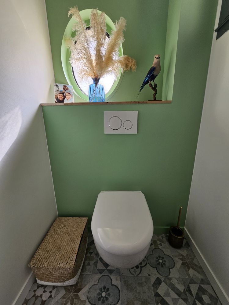 Le résultat est très réussi : les espaces sanitaires sont modernes, fonctionnels et harmonieux. La déco est très tendance, avec des touches de bois et de couleur. Le nouveau WC des combles apporte plus de confort au niveau de la chambre. C'est un bel exemple de rénovation et de création de sanitaires dans une maison.