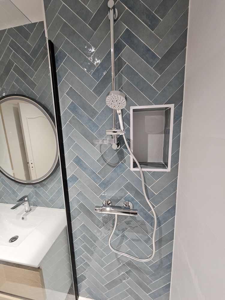 - Pose de faïence en bâtons rompus et création d’une niche dans la douche pour un look contemporain.