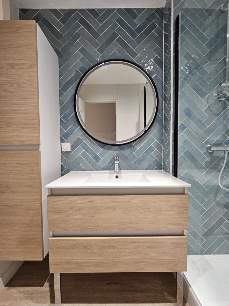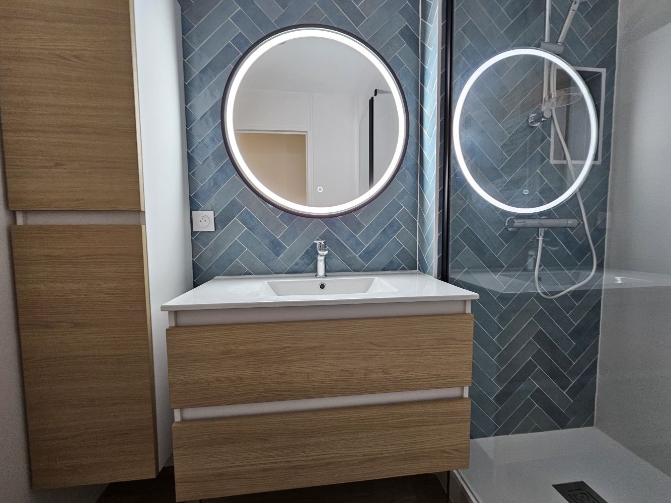 - Installation d’un meuble tendance et d’un miroir rond rétro-éclairé.
